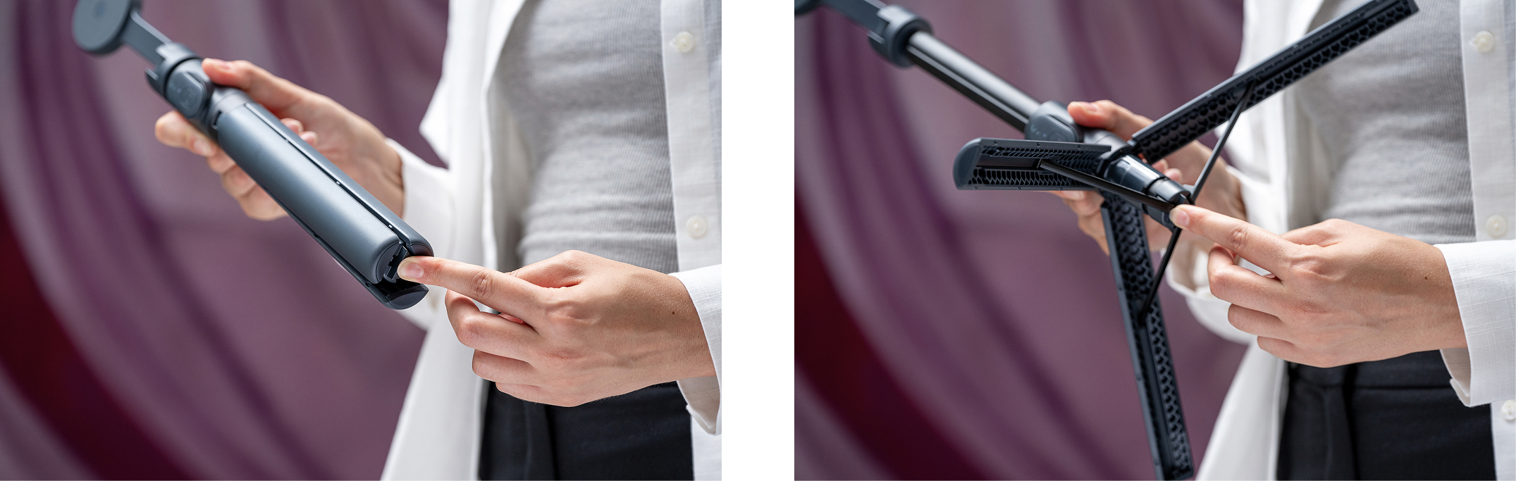 For SnapStand Max: Press the quick-release button at the bottom of the tripod to unlock the tripod's legs. Pull the area with the remote down to open the tripod's legs. Extend the SnapStand Max to your desired height and place it on the ground.